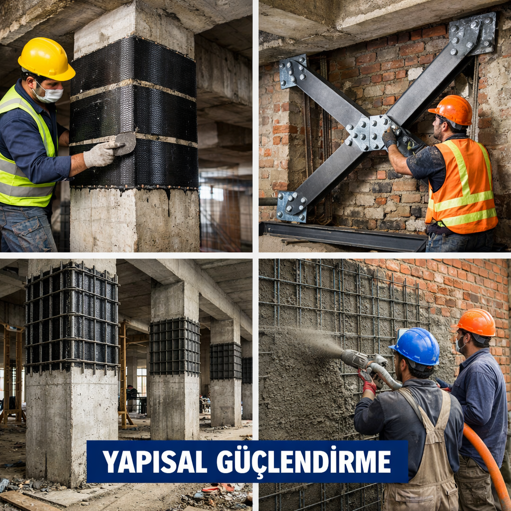 -Yapının taşıyıcı sistem dayanımı ve şekil değiştirme kapasitesinin artırılması. Yapıya yeni eleman eklenmesi, birleşim yerlerinin güçlendirilmesi, deprem etkisinin azaltılması amacıyla yapı kütlesinin azaltılması (Sistemin güçlendirilmesi)